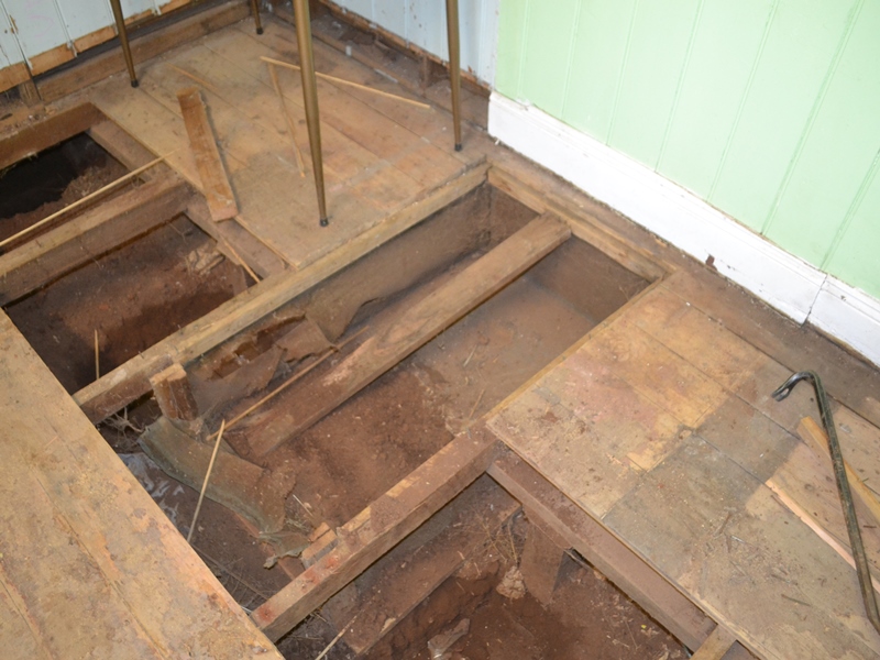 When we removed the kitchen floor coverings on our last visit, we noticed a small square of new flooring in the kitchen and quipped that perhaps it was a trapdoor leading to the cellar!