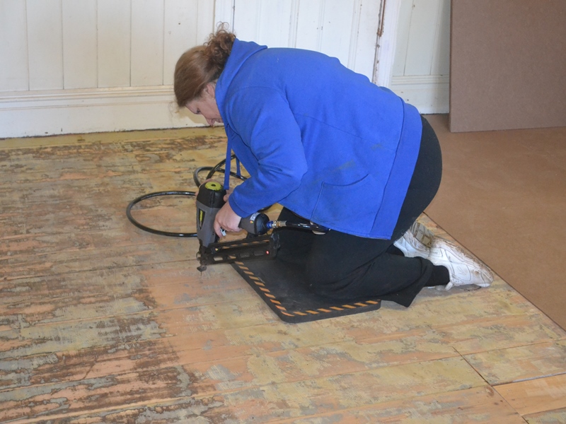 After repairing a section of floor in the doorway between the kitchen and lounge, we set about nailing the floor and laying the underlay, working out an extremely efficient production line process to glue and staple the underlay whilst efficiently recharging the glue and staple guns without missing a beat – teamwork at it’s best!