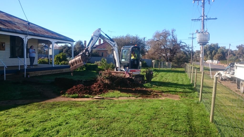 On Saturday morning whilst installing the gate, local contractor Randall stopped by to let me know he would call in on Monday with his backhoe to dig out the stumps from the old and ugly trees and palms we had chopped in the front yard. Half an hour later I heard a racket out the front and went to investigate, only to discover that Randall had changed his mind and decided to rip the stumps out straight away. Bonus!