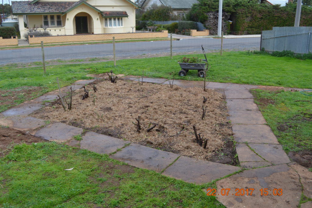 After a brisk walk into town first thing Saturday to put on my lotto tickets, the trailer was unloaded and after a walk around the grounds to inspect the citrus trees we set about preparing the front “diamond” garden for the rose plants. A few hours, several barrows of weeds and a whole lot of effort later, we had a rose garden planted complete with (temporary) automatic watering system.