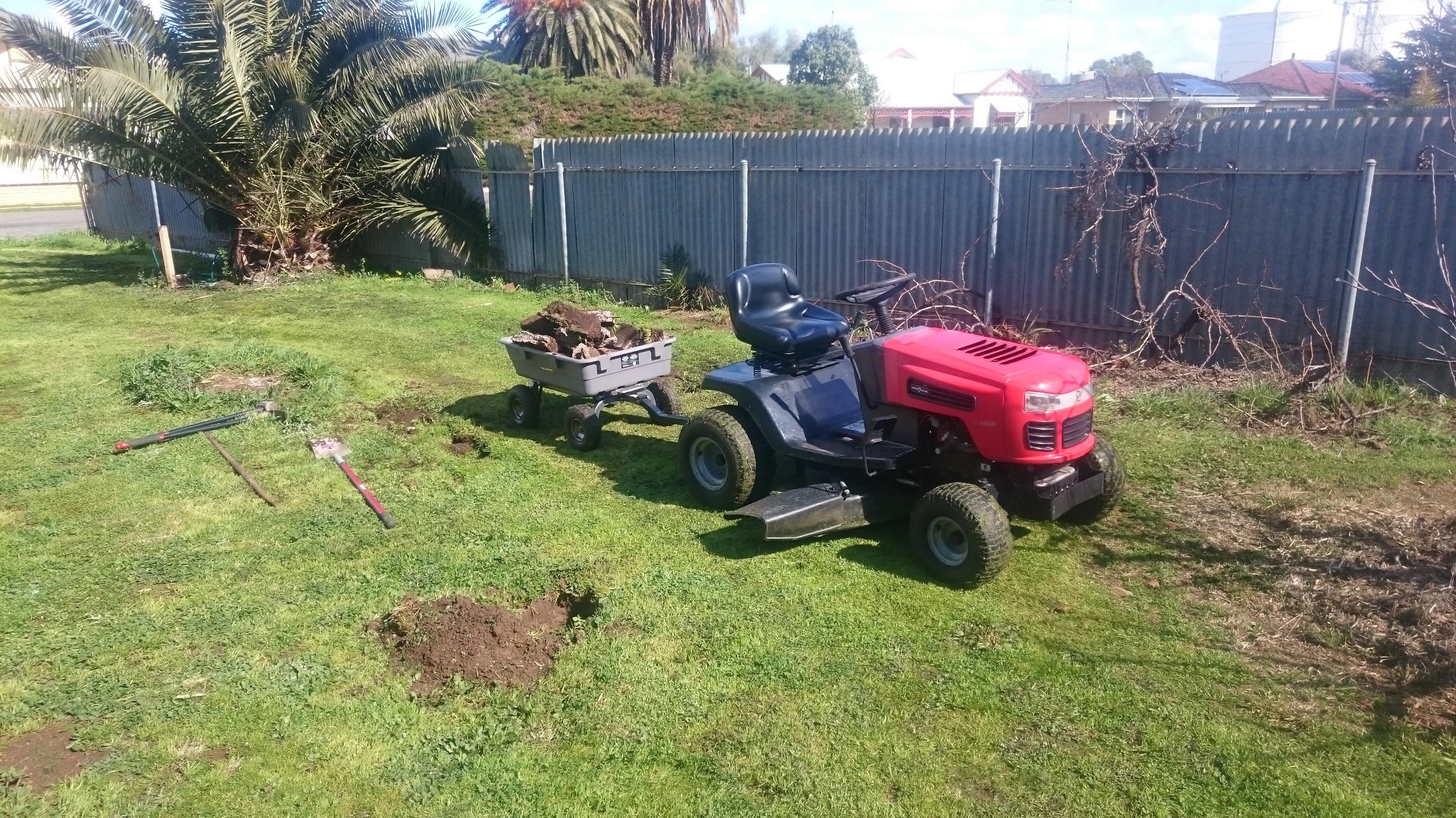 By the weekend of 19th and 20th the yard was more than due for another mow. This time it was just Skylar and I who made the trip up the Calder, and again the ride-on proved its value… mowing and trimming were done within a couple of hours, leaving me time to dig up an old concrete spoon drain in the side yard. Again the ride-on showed just how versatile it can be, this time by hooking up the yard cart to its towbar allowing me to easily cart the concrete to the rubbish pile in just a couple of trips behind the mower, rather than making several trips with a wheelbarrow.