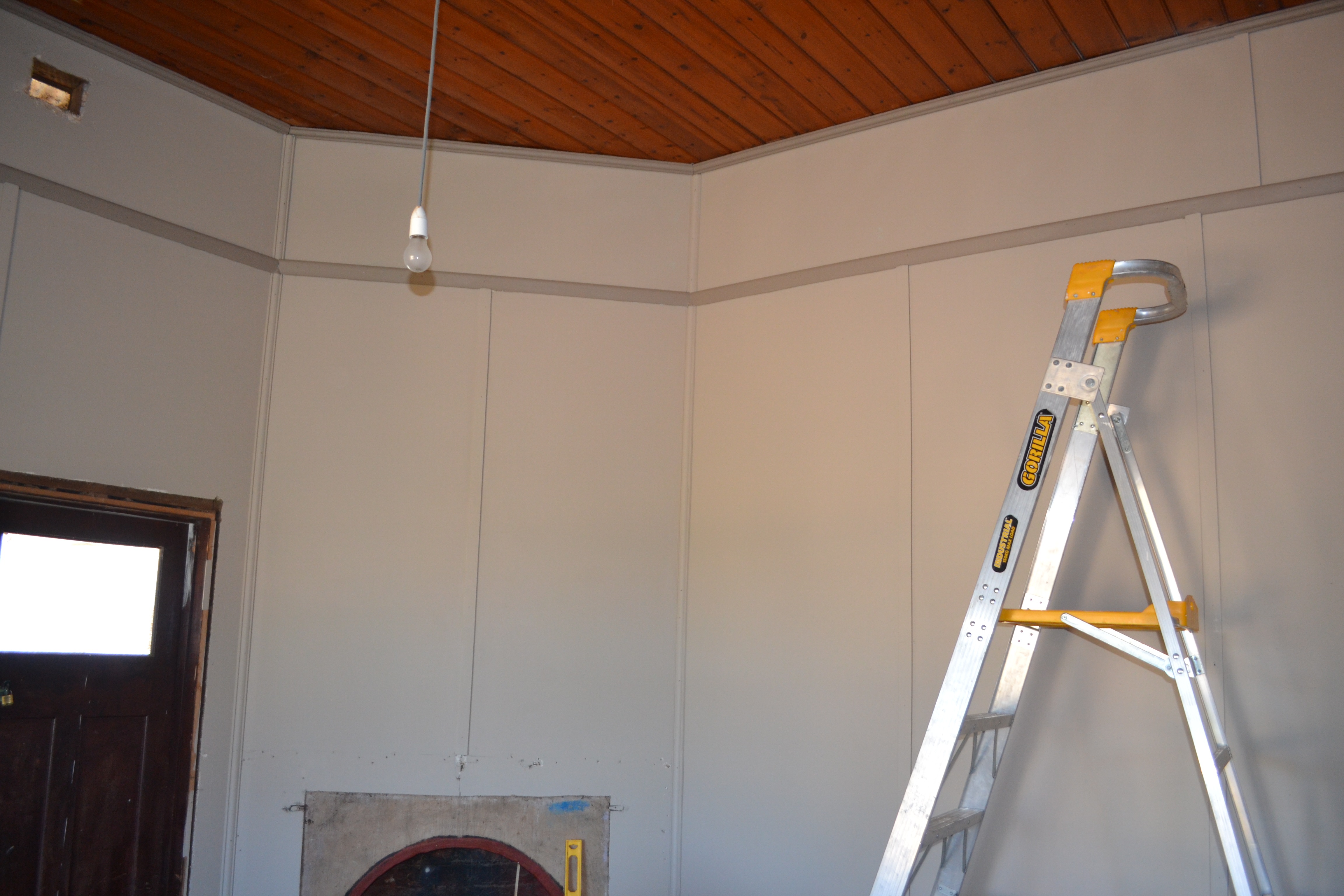 By Saturday evening Shirleen had stripped around half the window and I had finished filling, skimming and sanding the walls, so Sunday was to be the start of the exciting bit… painting over the horrible grotty blue walls with our carefully chosen colour scheme… mushroomy walls with contrasting picture rail and cornice.